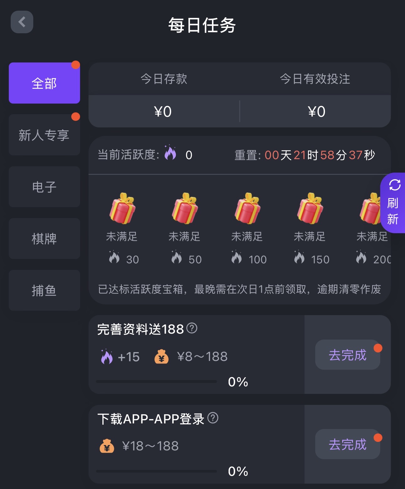 新用户注册绑卡完善所有资料,点击优惠-每日任务里面自助领取8-188